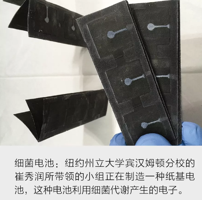 在紐約州立大學賓漢姆頓分校,崔秀潤(Seokheun Choi)小組正在開發一種紙基電池,這種電池具有一種非傳統的電子來源——細菌。可以在泥坑里找到某些細菌,在代謝食物時產生電子。這些細菌附著在印在紙上的金屬電極上,金屬電極收集排放出的電子。產生幾微安培的電流需要一堆細菌電池,這通過折紙手工很容易實現——只需將紙多折疊幾次。