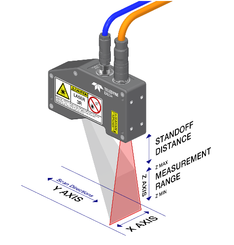 在典型的激光線輪廓儀中,激光線條被投射到物體上,并使用一個2D(區域/矩陣)圖像傳感器進行成像。在確定激光條紋在圖像傳感器上的位置后,輪廓儀會提供由激光條紋的光學三角測量產生的橫向(X軸)和深度(Z軸)信息。沿著激光線生成的XZ對集稱為輪廓。沿運動方向的兩個連續輪廓之間的距離構成第三軸(Y)。通過這種方式掃描物體,我們獲得了物體的表面掃描信息(X,Y,Z)。