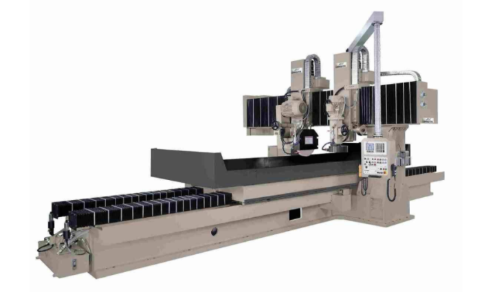 精密龍門磨床主要用砂輪周邊磨削加工大型短寬工件的平面。磨削時(shí)工件可直接固定在工作臺(tái)面上或電磁吸盤上。龍門磨床采用龍門式布局,包括床身、雙立柱、橫梁組成封閉的剛性框架結(jié)構(gòu)。床身采用雙V型導(dǎo)軌,工作臺(tái)導(dǎo)軌面覆有耐磨聚四氟乙烯。拖板沿橫梁導(dǎo)軌作橫向運(yùn)動(dòng),橫向進(jìn)給由直流電動(dòng)機(jī)驅(qū)動(dòng),由數(shù)控進(jìn)給。工作臺(tái)縱向運(yùn)動(dòng)由葉片油泵驅(qū)動(dòng)。可無(wú)級(jí)調(diào)速,采用開(kāi)式液壓系統(tǒng),液壓油與導(dǎo)軌潤(rùn)滑有油溫控制裝置。磨頭可沿拖板垂直導(dǎo)軌做上下移動(dòng)。垂直進(jìn)給有快速和自動(dòng)、手動(dòng)進(jìn)給兩種方式。磨頭主軸采用套筒式結(jié)構(gòu)和連接式傳動(dòng),主軸軸承為高精度向心推力球軸承。