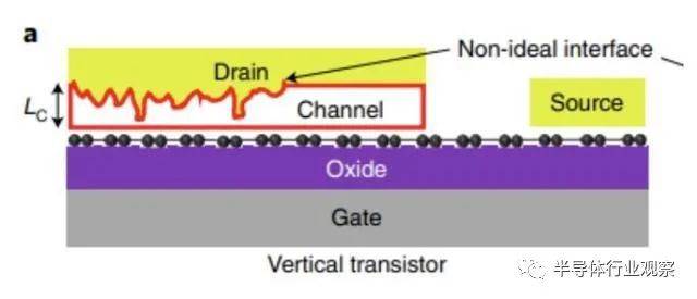 更重要的是,這種垂直場效應晶體管不是平行排列的,是垂直排列的。這種縱向的結構具有天然的短溝道特性,半導體溝道位于底電極與頂部電極之間,溝道長度僅取決于材料厚度。